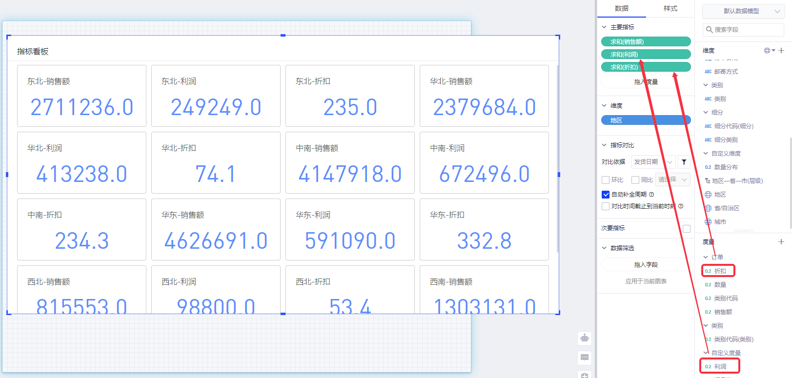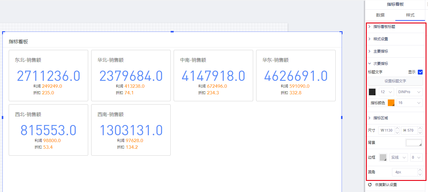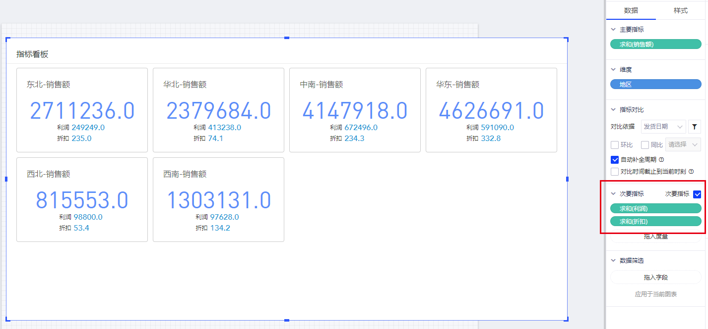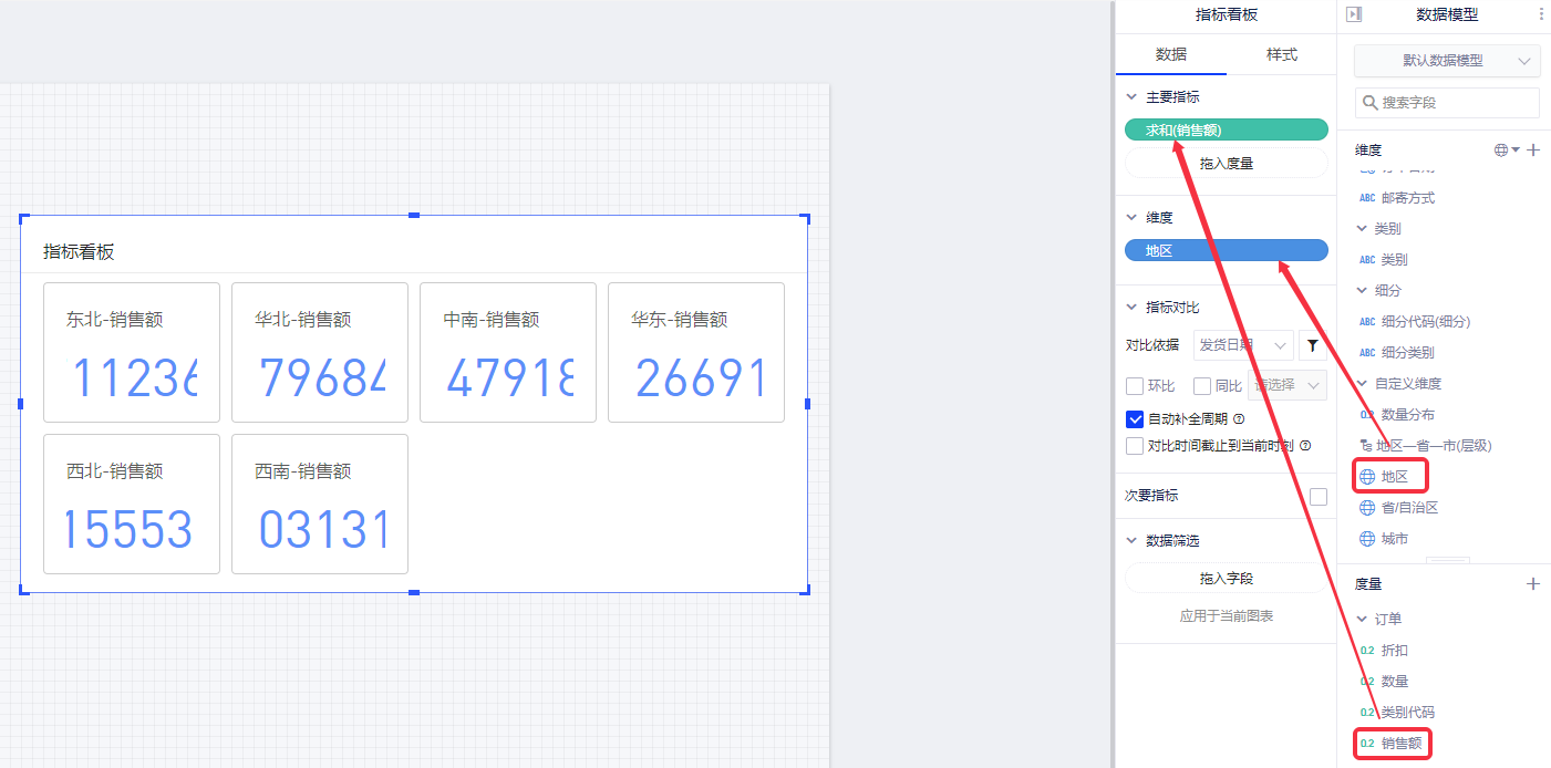 指标看板可以简单理解为多个指标卡的组合控件,帮助您轻松实现添加多个指标卡。以默认数据模型为例,查看各地区的销售额情况。