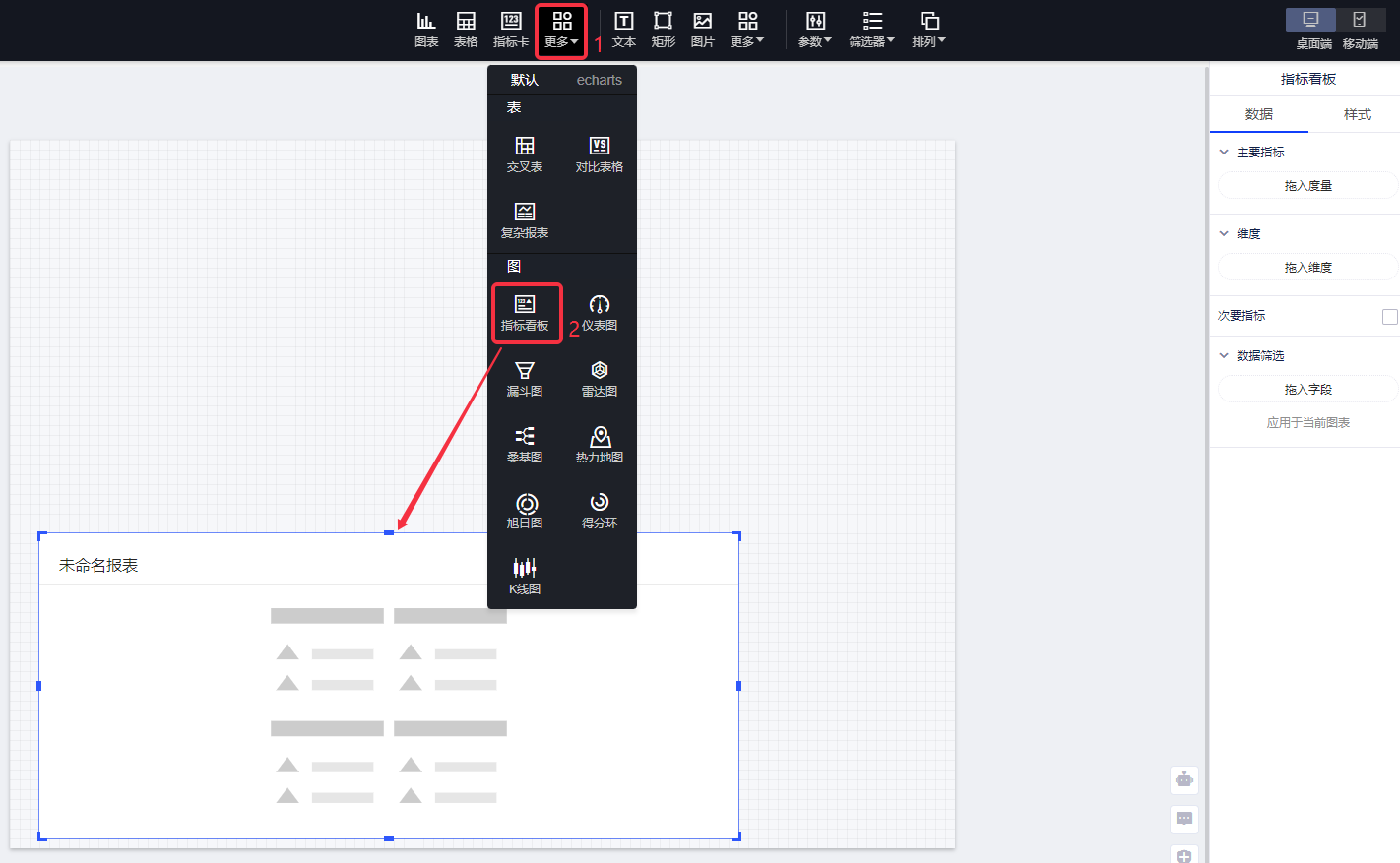 (1)选择[指标看板]控件,在画布上画出[指标卡看板];